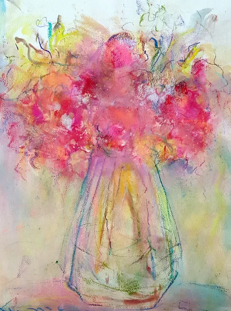 the painting is inspired by the consciousness of Joy using fresh arranged flowers picked from a store as a subject.they are painted in luminous layers with keeping the spirit of the color and meaning