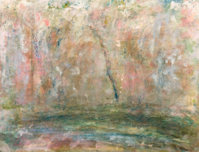 Soft pastels and misty textures merge in Salazar’s ethereal woodland scene. “Whispers of Spring” captures the delicate transition of seasons with dreamy brushwork and poetic atmosphere.