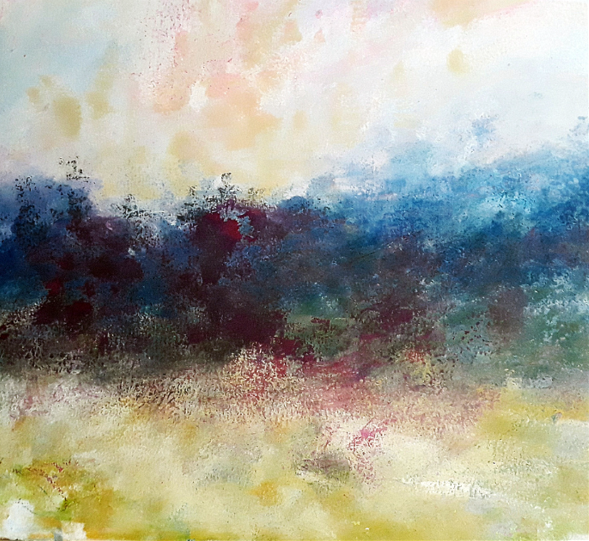 A dreamy abstract painting blending pastel yellows, blues, and deep purples to evoke a serene landscape at dawn. The textured brushwork creates a calming, impressionistic mood.