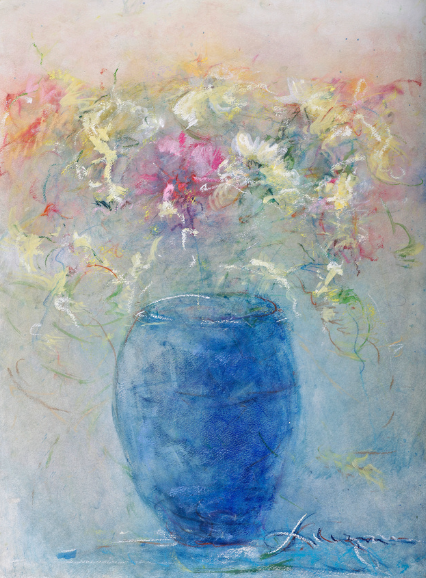A delicate pastel artwork depicting a blue vase filled with light, airy flowers in soft pink, yellow, and white hues. The gentle strokes create an impressionistic, dreamy bouquet.