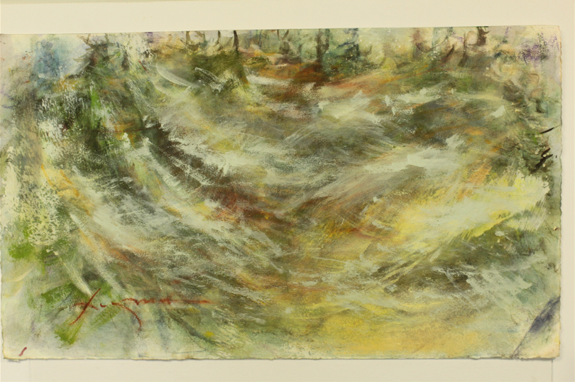 An evocative impressionistic painting depicting the textured and layered forest floor with swirling brushstrokes and earthy tones, capturing the essence of nature’s complexity by Steve Kuzma.